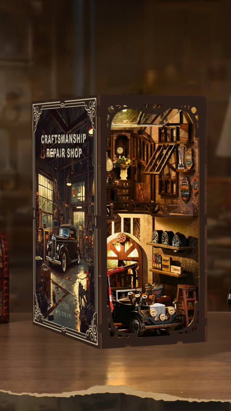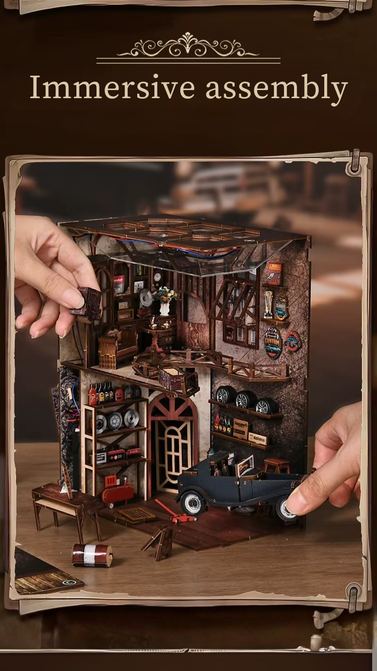 Step into a time of oil cans, leather gloves, and vintage craftsmanship with the Retro Auto Repair Shop, a rugged and nostalgic DIY book nook kit that celebrates the golden age of garages. Featuring a classic roadster on the lift, rows of tiny tools, and wood-paneled walls lined with tools and spare parts, this miniature scene brings mechanical history to life in stunning detail.