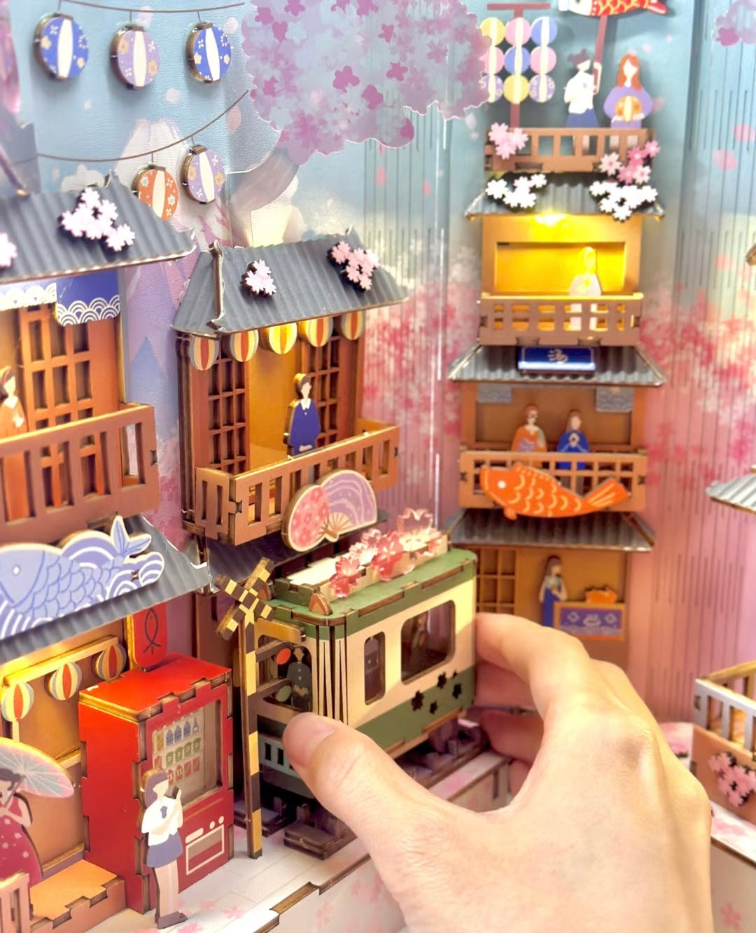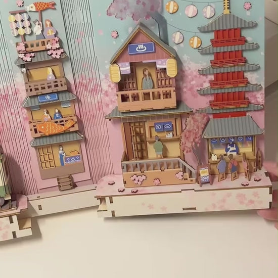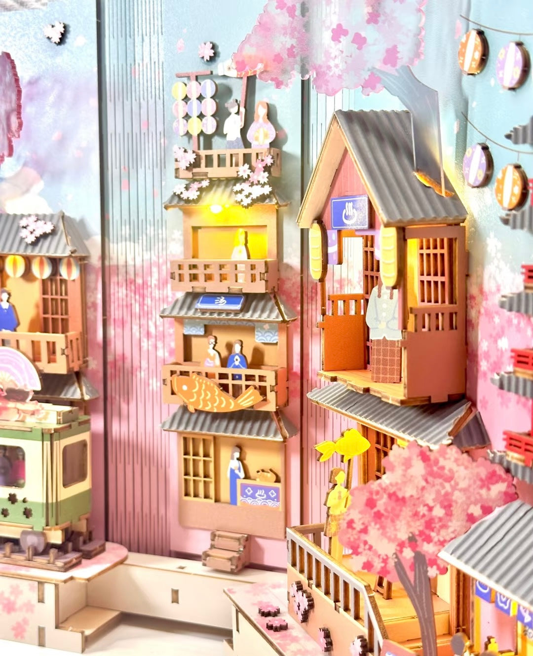 Wander beneath lanterns and blooming cherry blossom trees in this elegant DIY book nook kit—Sakura Market, a miniature escape into a spring evening in Japan. With glowing shopfronts, delicate lanterns, and visitors strolling through sakura-lined streets, this handcrafted miniature captures the peaceful energy of a hanami night.