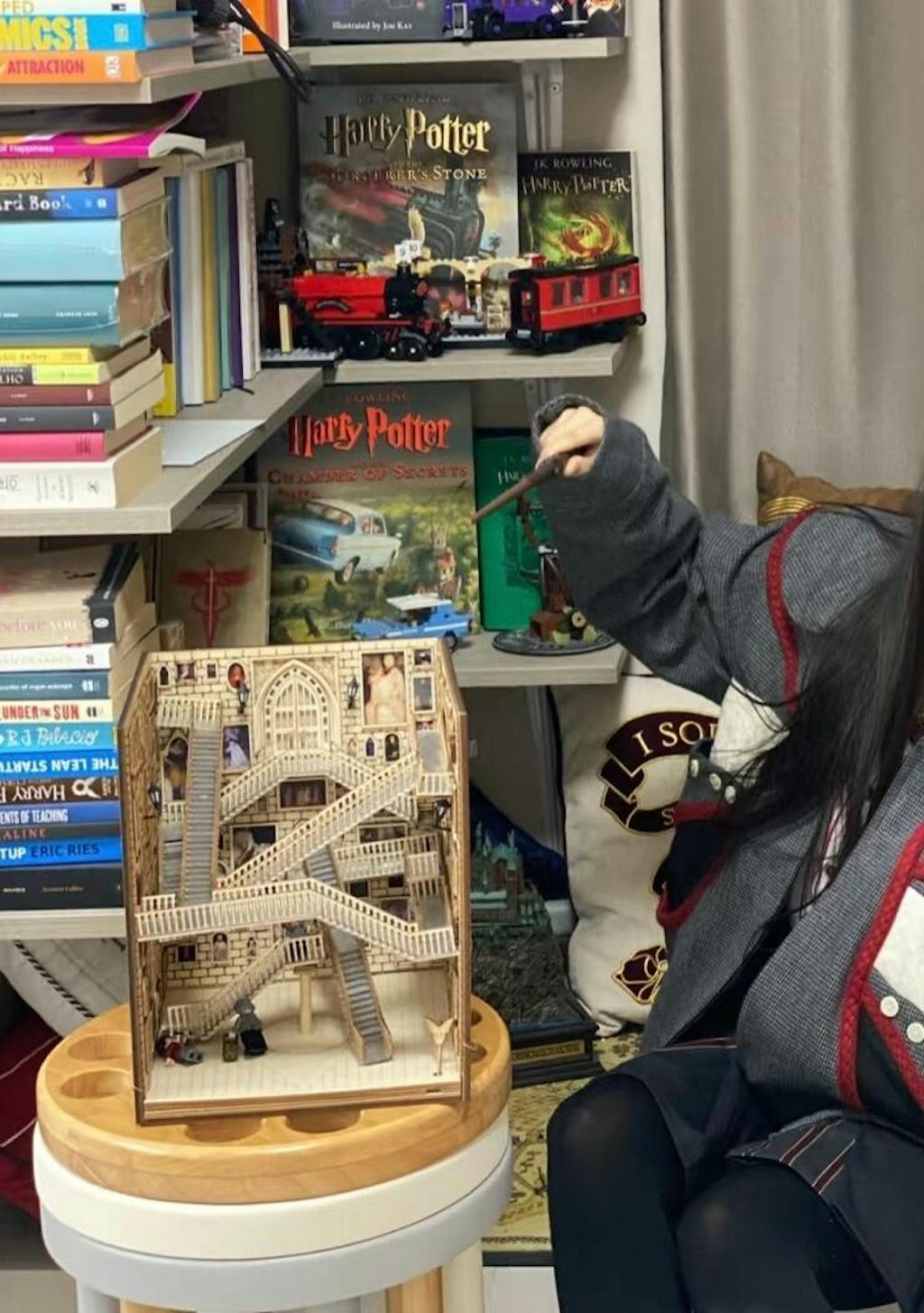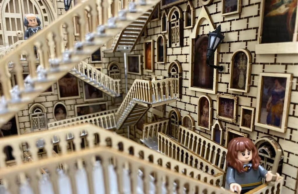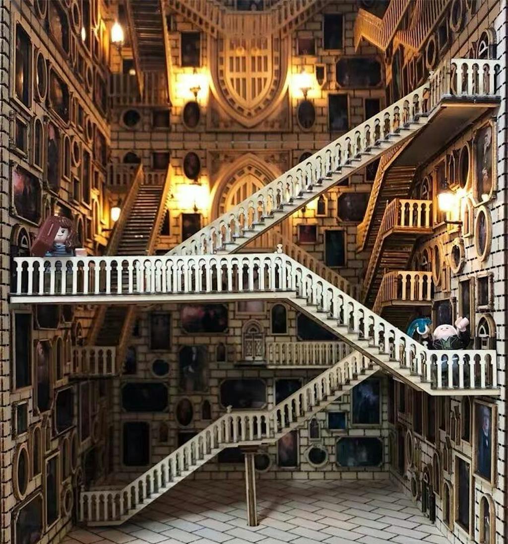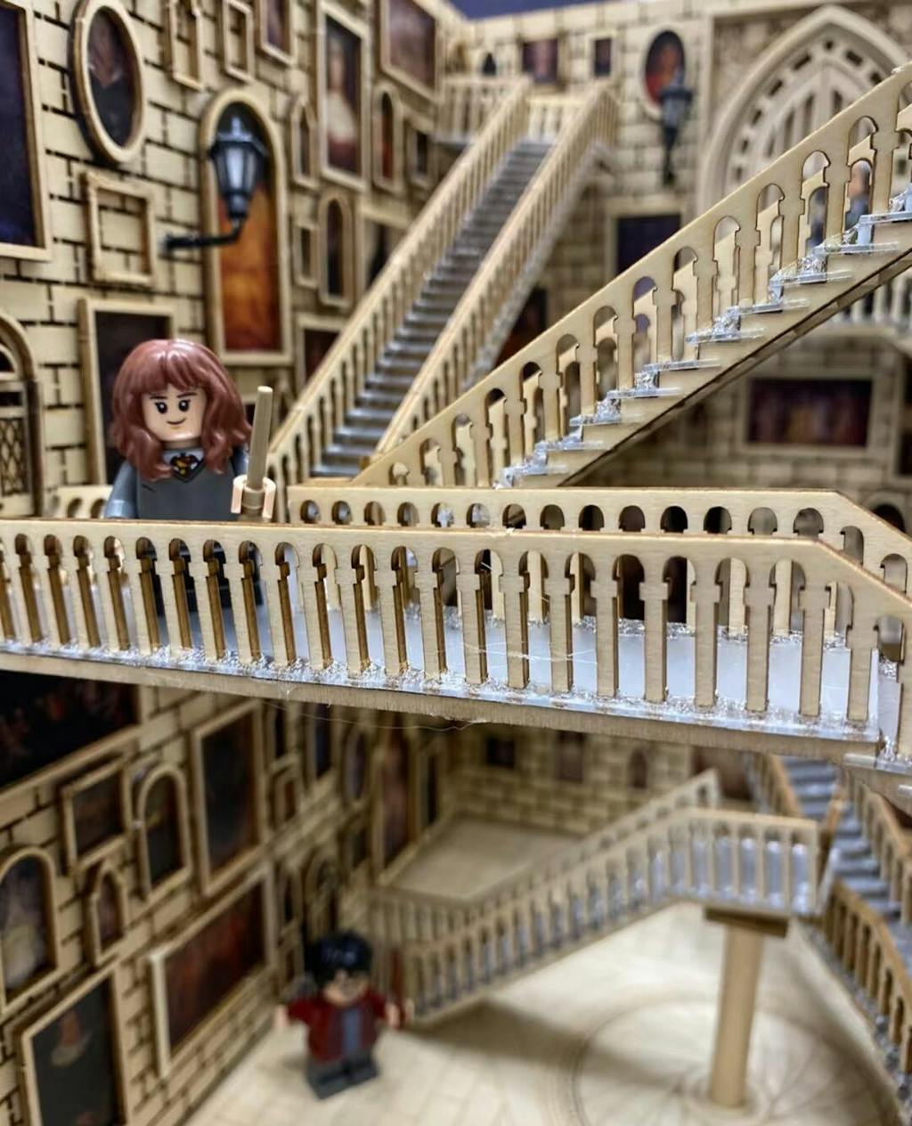 Assembling the Hogwarts-style rotating staircase from small wooden boards, was tough on the hands. I thought I could finish it in one morning, but it ended up taking a full four days. The difficulty and complexity were way beyond what I expected. But itâs incredibly satisfying in terms of detail and has great playability.