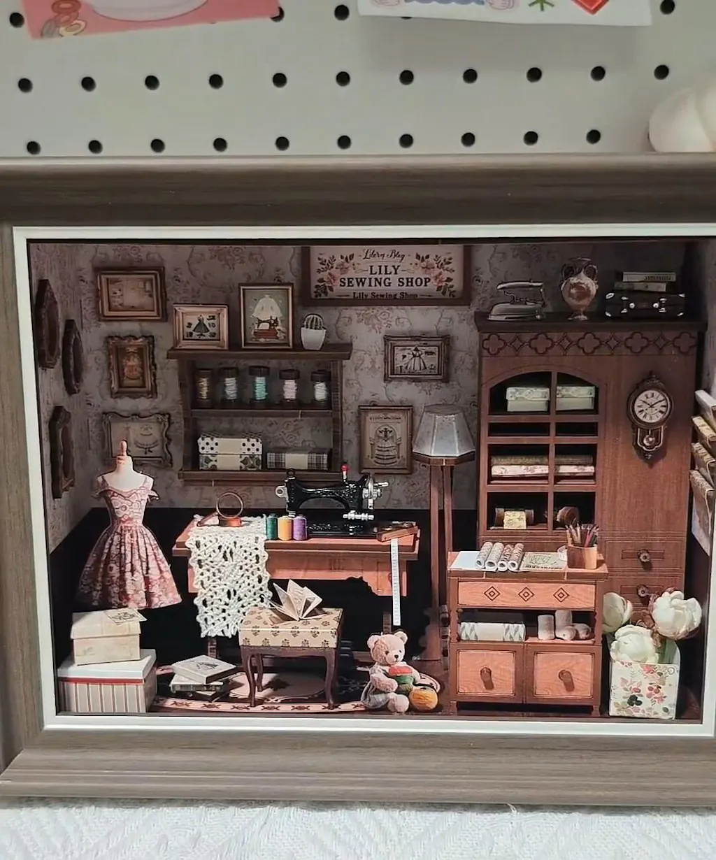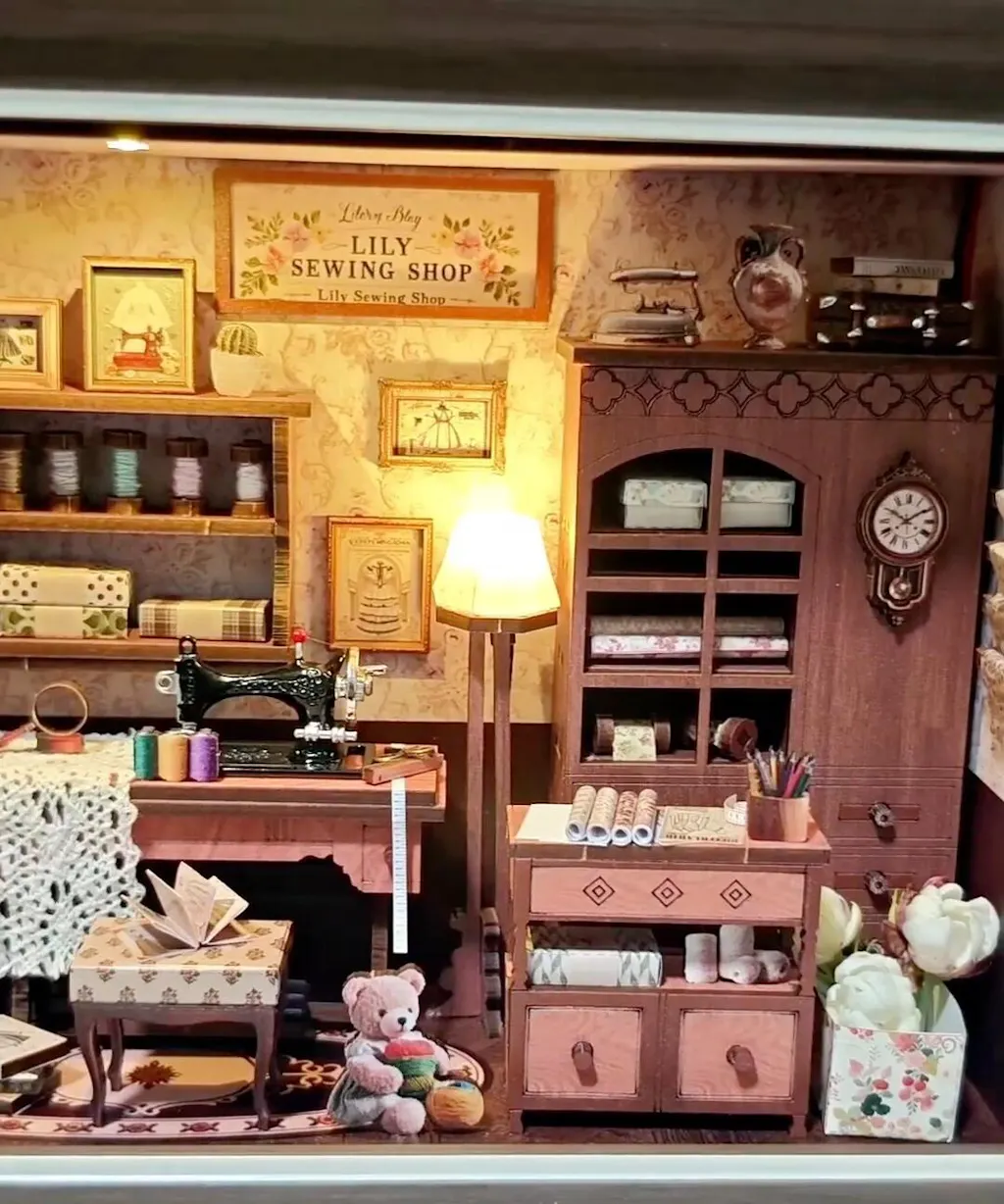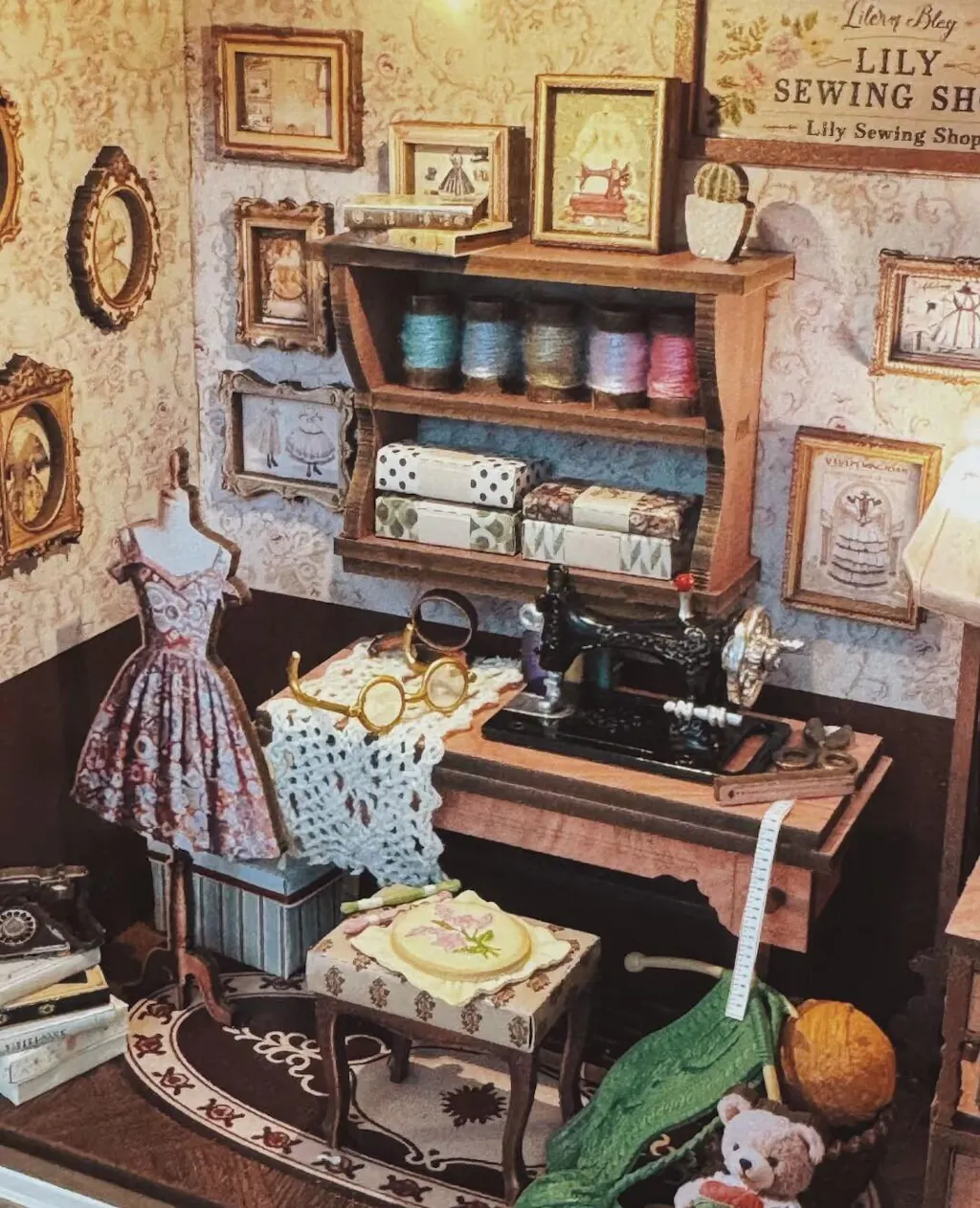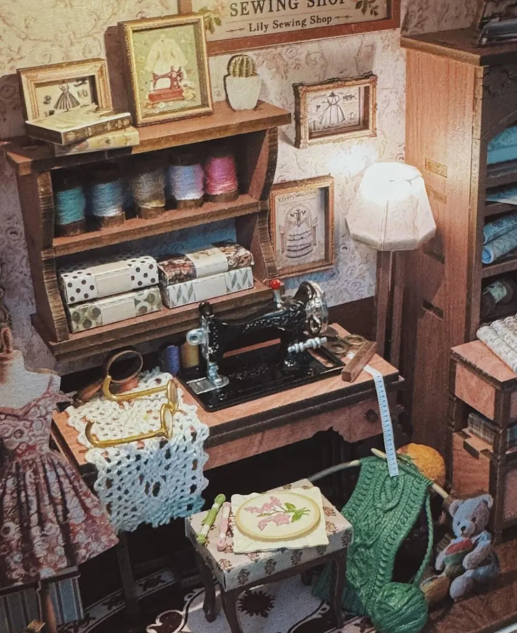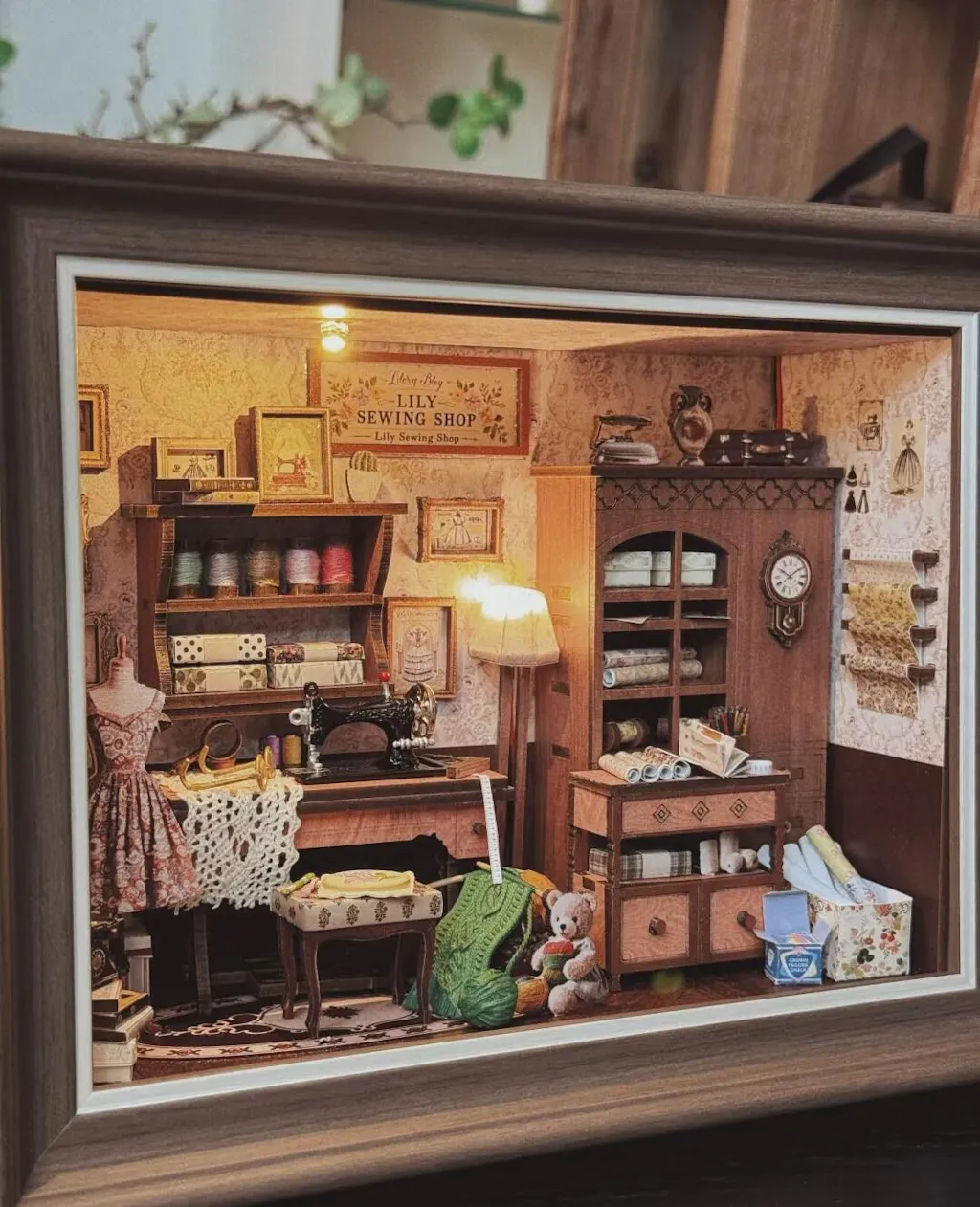 This is a belated Mother’s Day gift, but imagining the look of surprise on my mom’s face when she receives it makes all the waiting worthwhile. This miniature is full of details: the sewing machine not only looks good, but its wheel can actually turn. The storage drawers are filled with thread spools and folded fabrics. I also added my own tiny accessories—mini reading glasses, an embroidery hoop, tailor's chalk for marking patterns, an unfinished scarf, and balls of yarn in a basket—to make the whole scene feel even more realistic. When I finally turned on the lighting, this felt like I was weaving my love for my mom in every detail!