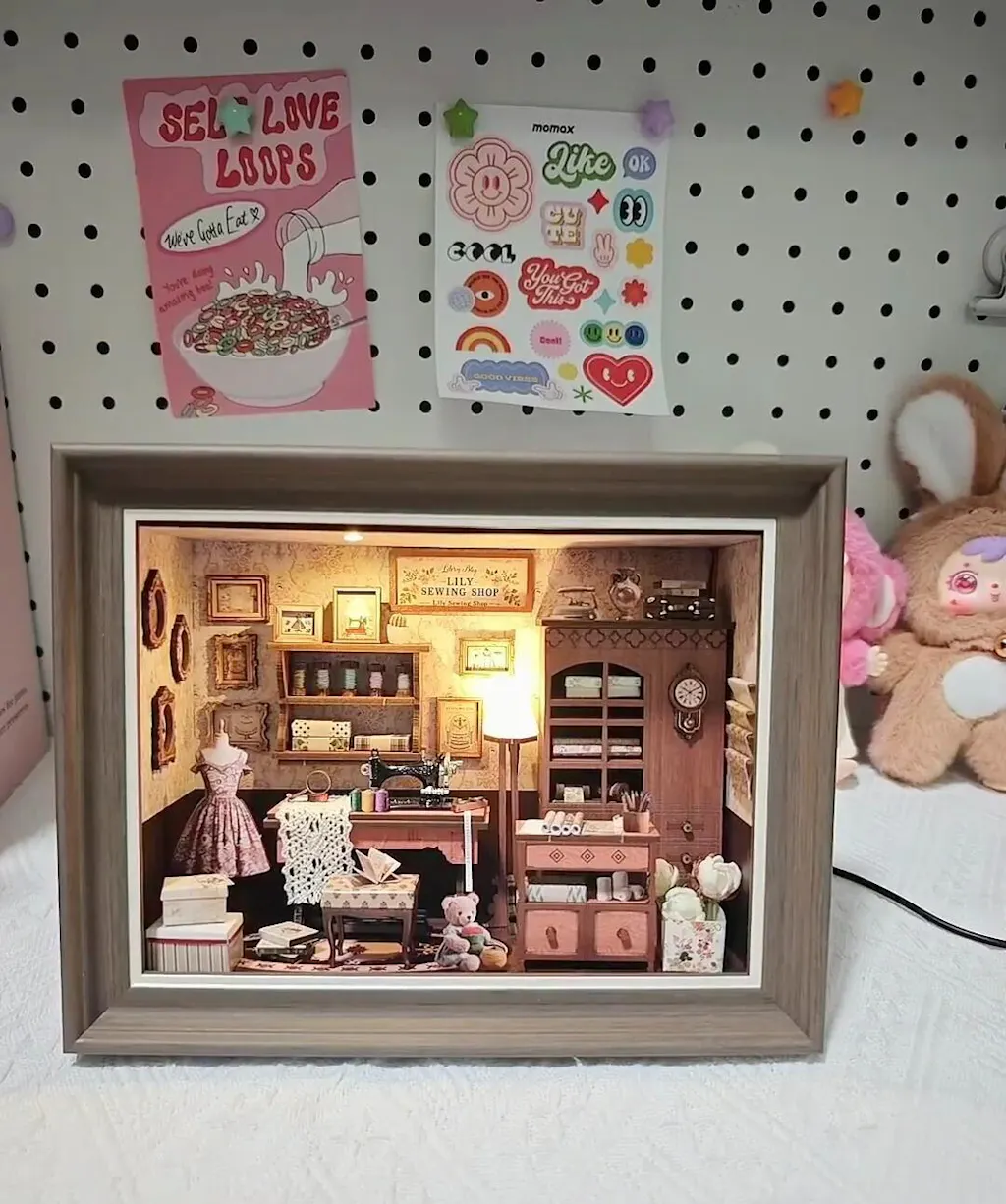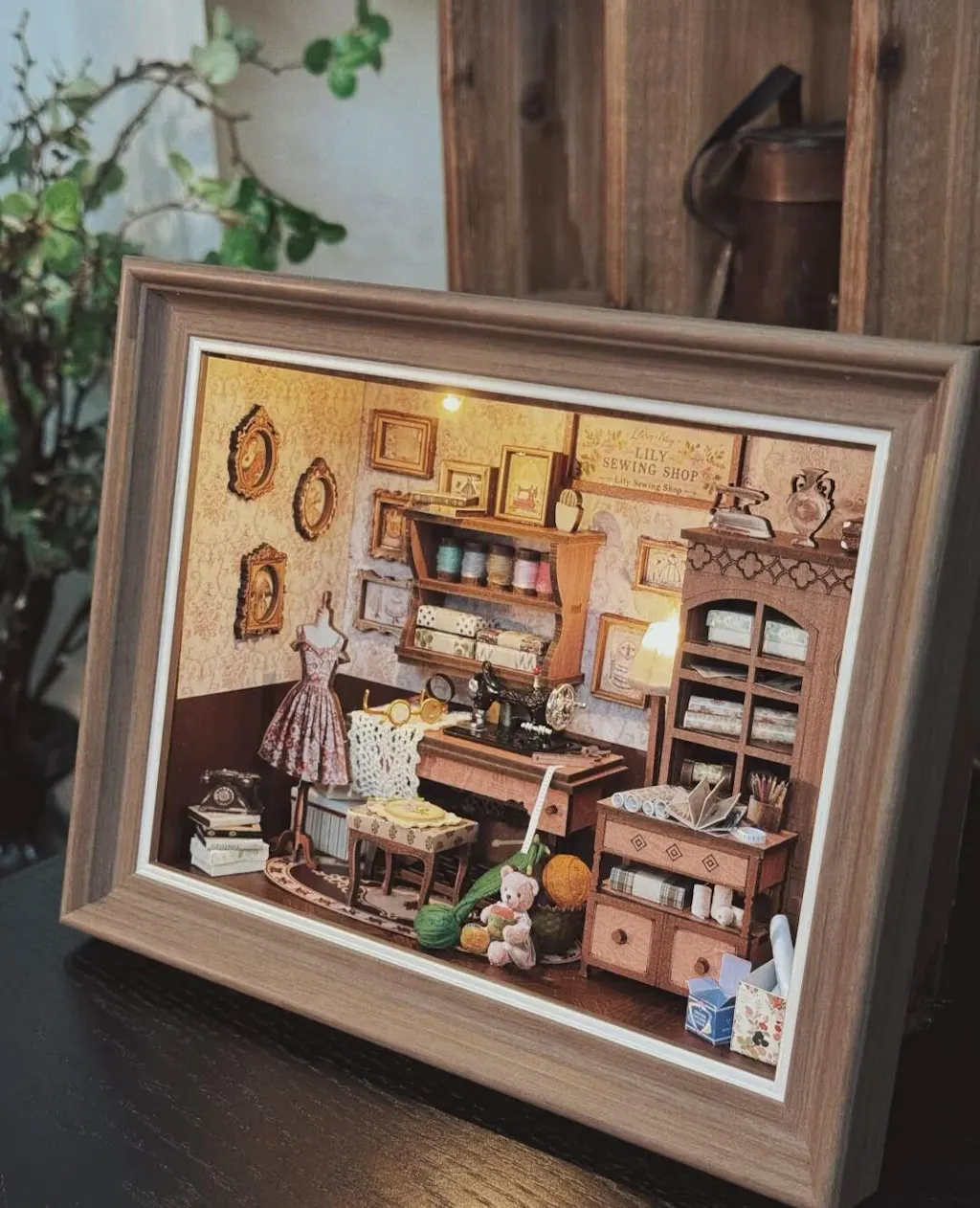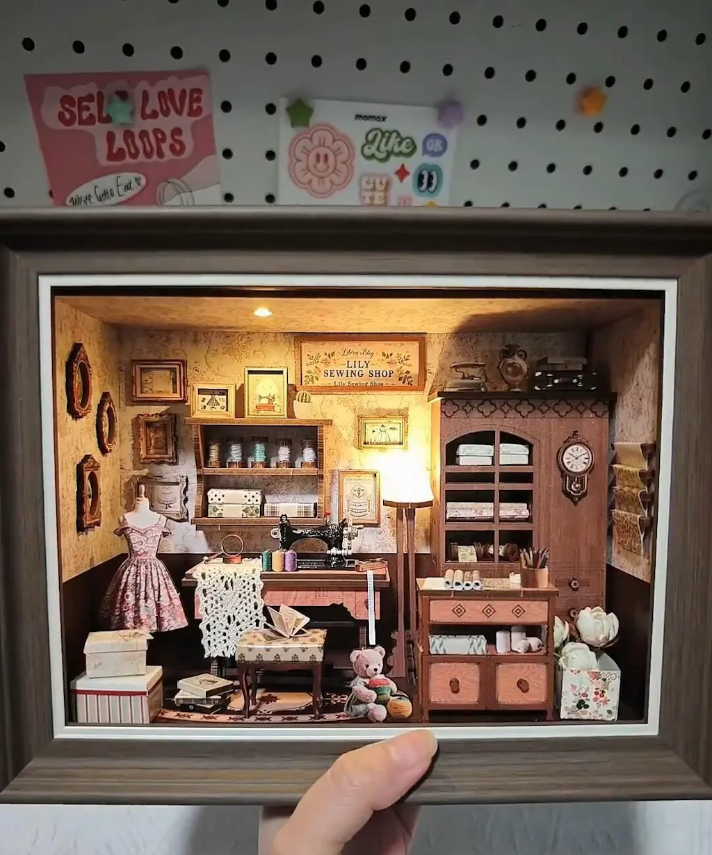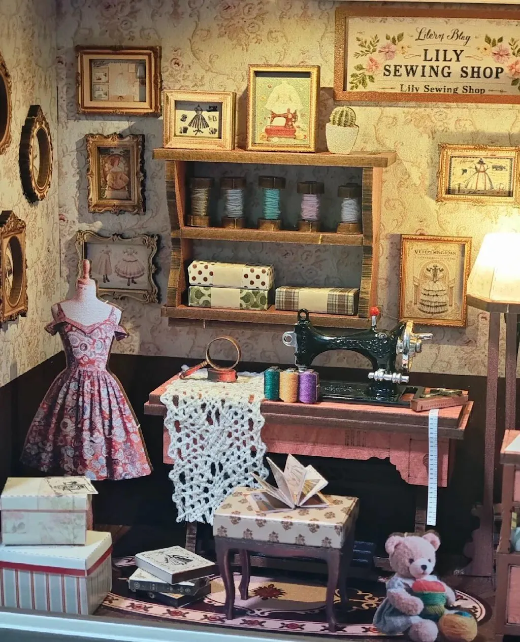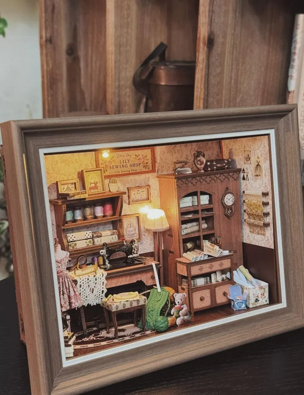 This is a belated Mother’s Day gift, but imagining the look of surprise on my mom’s face when she receives it makes all the waiting worthwhile. This miniature is full of details: the sewing machine not only looks good, but its wheel can actually turn. The storage drawers are filled with thread spools and folded fabrics. I also added my own tiny accessories—mini reading glasses, an embroidery hoop, tailor's chalk for marking patterns, an unfinished scarf, and balls of yarn in a basket—to make the whole scene feel even more realistic. When I finally turned on the lighting, this felt like I was weaving my love for my mom in every detail!