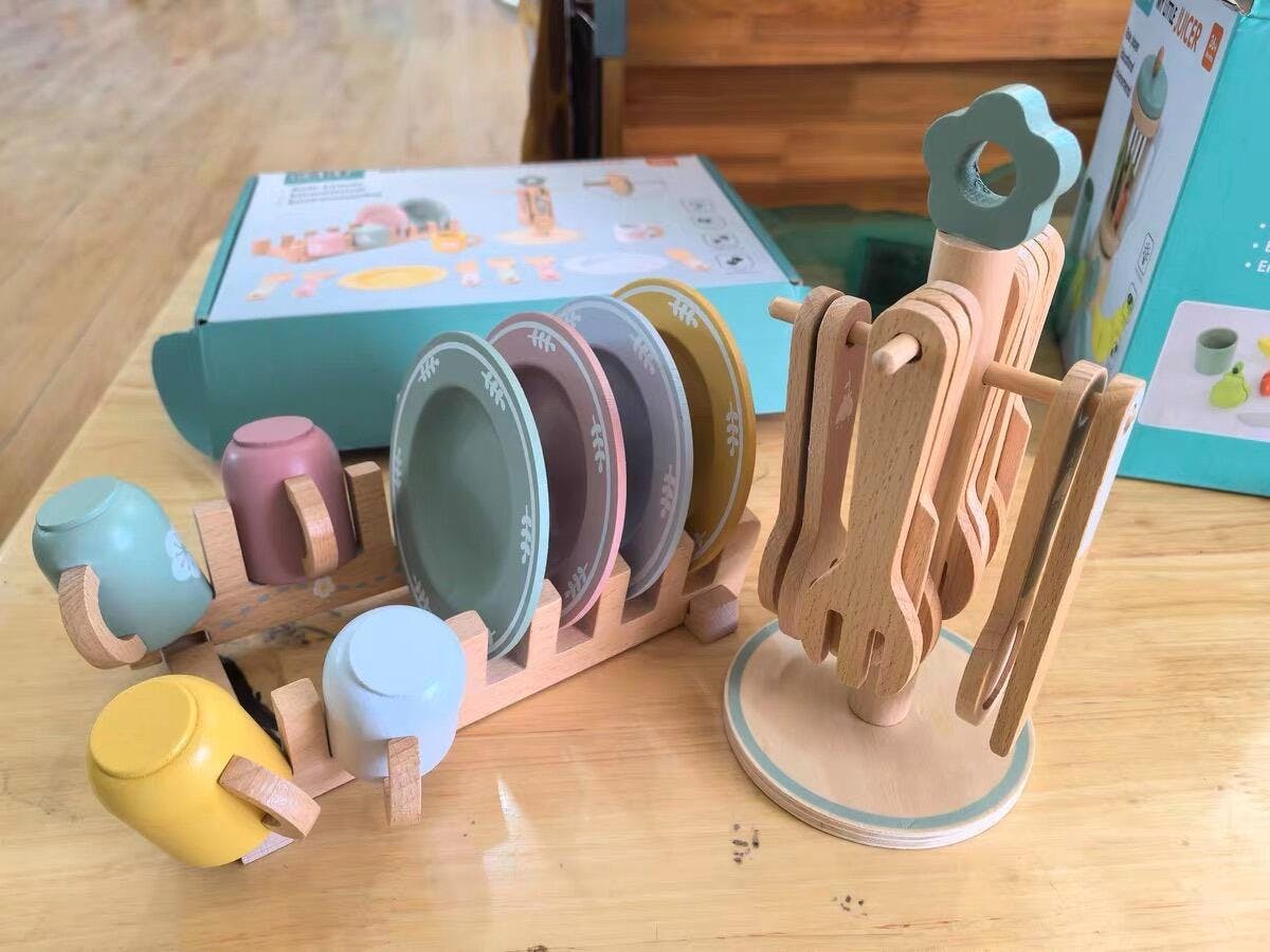 Bring mealtime to playtime with this beautifully designed Montessori wooden tableware set. Complete with plates, cups, utensils, and a drying rack, this set lets little ones practice real-life skills through imaginative role play. Each piece is crafted from smooth, durable wood and painted in soft, pastel colors with delicate details—perfect for little hands.