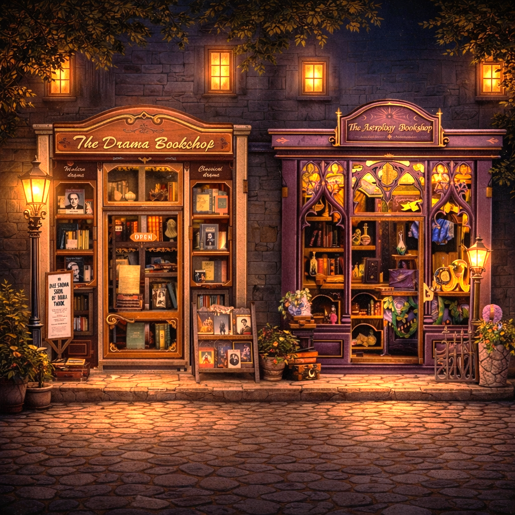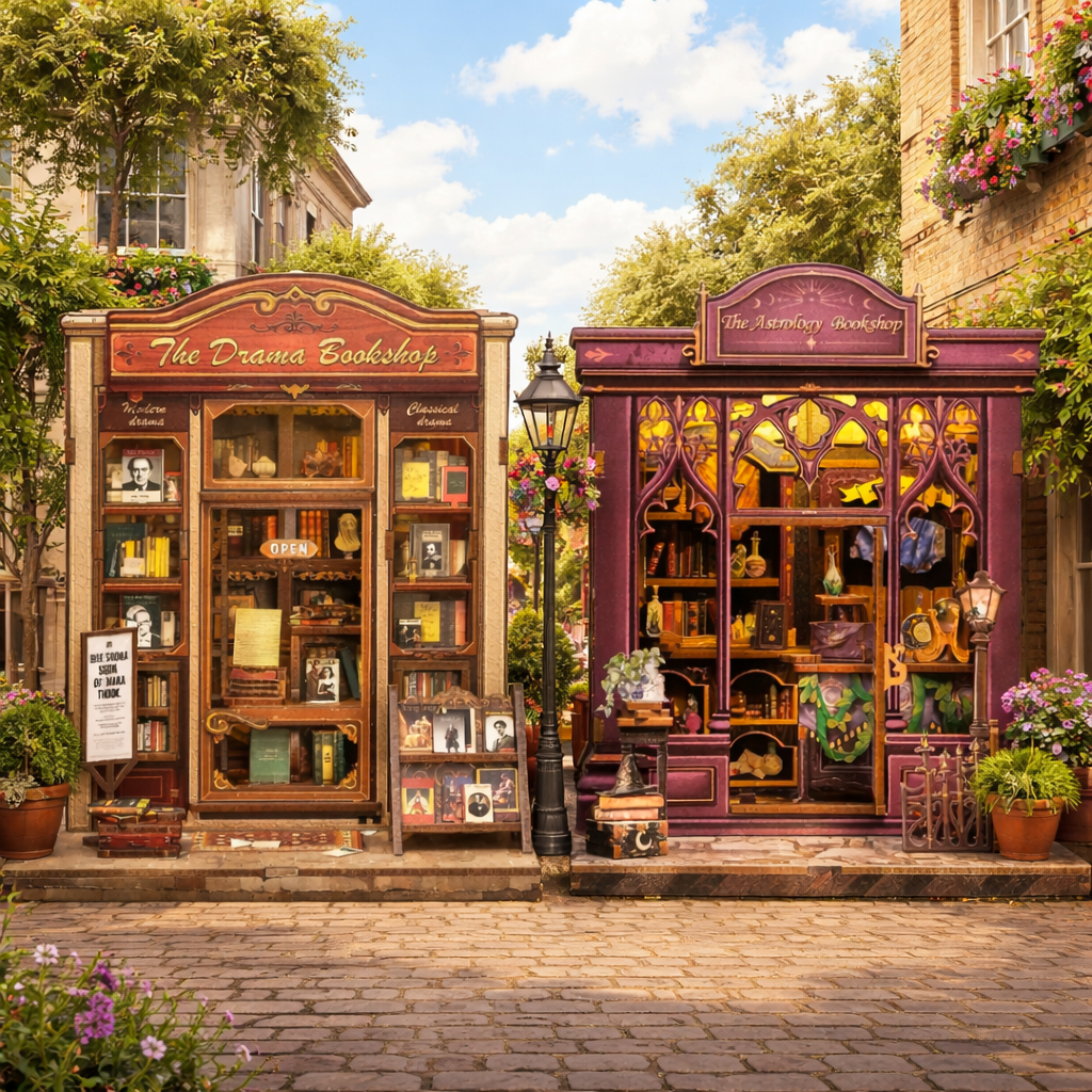 Drama & Destiny Bookshops bundle brings together two neighboring shops that feel connected yet distinct. One is rooted in the world of theater, lined with scripts, playbills, and stories shaped by human emotion and performance. Next door, an astrology bookshop looks to the sky, filled with star charts, celestial texts, and objects that hint at fate and the cosmos. Side by side, the two spaces reflect the contrast between what we create on stage and what’s written in the stars—a detailed miniature scene designed for slow building, quiet focus, and display.